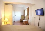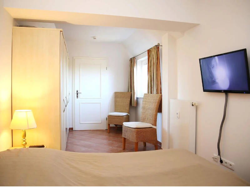 Doppelbett, Kommode, Kleiderschrank, TV, Fliesen