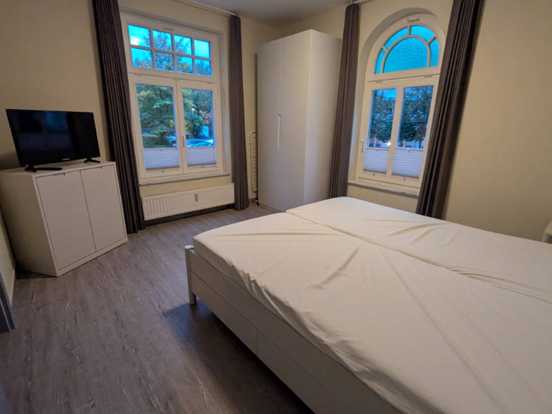 Doppelbett, Kommode, Kleiderschrank, TV, Vinylboden